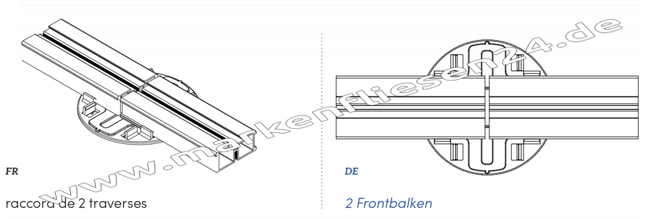 Kopf SE mit Kreuz-Aufsatz für Aluminiumtraversen. Auf diesen neu entwickelten Stelzlager-Kopf kann man einen, zwei, drei oder vier Aluminiumbalken gleichzeitig auf das Stelzlager anbringen. Man kann ihn mit dem klassischen Kopf, der nur einen oder zwei Aluminiumbalken trägt ersetzen. Bei mehr als einem Aluminiumbalken, die auf dem Kopf platziert werden, spricht man von einer Querverbindung. Der Kopf hat 8 vertikale Klammern, die mit einem Loch versehen sind, um die Seiten des Balkens zu befestigen. Der Kopf wurde in zwei verschiedenen Ausführungen produziert: schwingender Kopf für die Stelzlager SE und ein nicht schwingender Kopf für die Stelzlager NM.